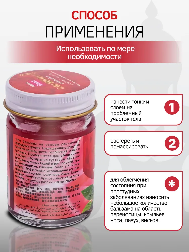 Красный тайский бальзам рекомендован к применению в качестве дополнительного средства в комплексной терапии и профилактики заболеваний суставов, ревматизме, остеохондрозе, полиартрите, радикулите. Он обладает разогревающим эффектом, активизирует кровообращение, обменные процессы, повышает эластичность связок.